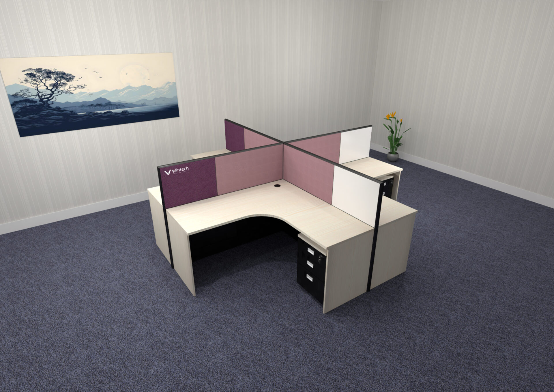 A perfect solution for collaborative zones, the Cluster variant supports four-person configurations that encourage teamwork, while maintaining clarity through structured surfaces and shared utilities.